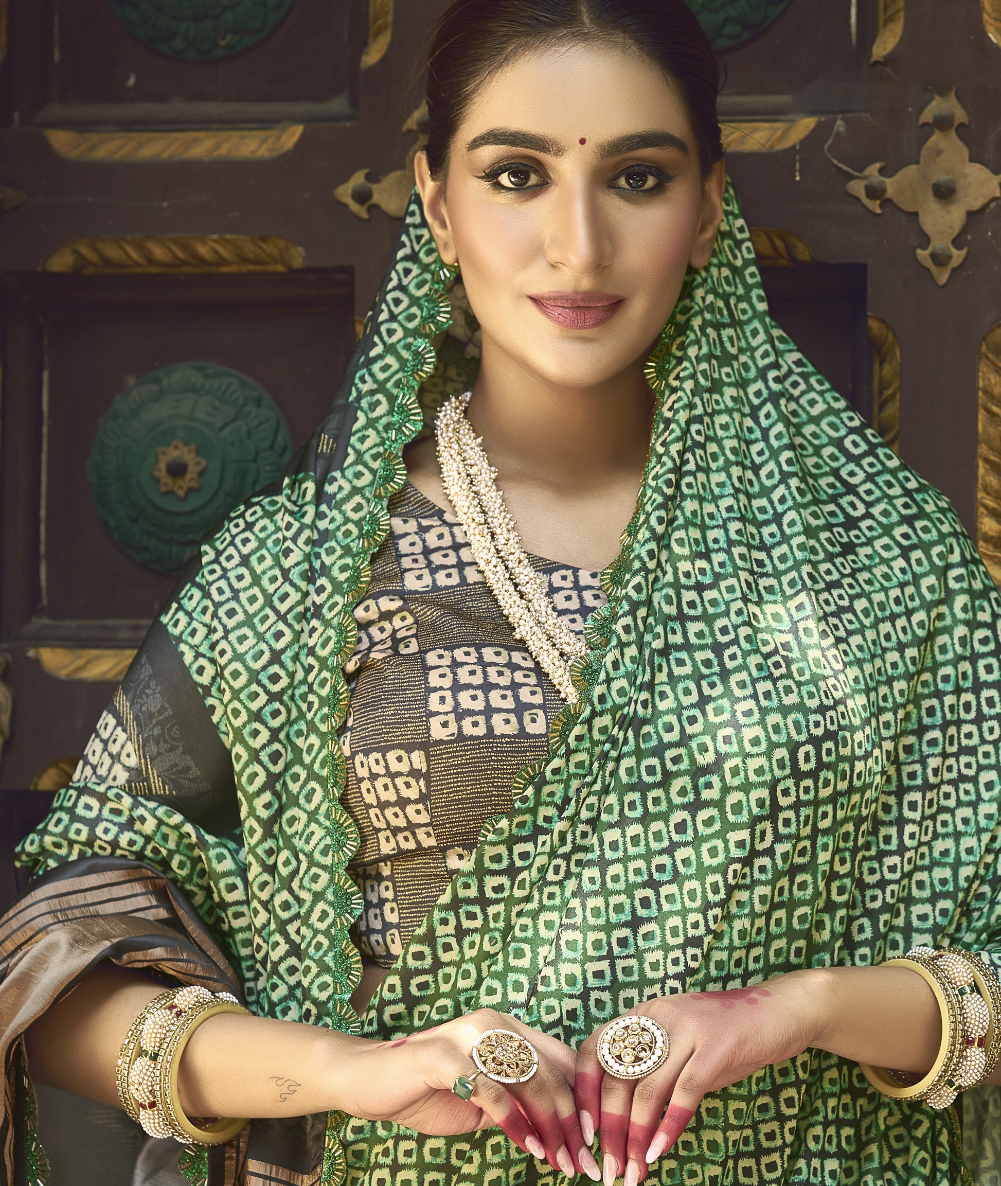 Embrace elegance with this exquisite green Gajri silk saree, adorned with intricate Gota and Minakari work. Paired with a sophisticated grey pure satin silk blouse, this ensemble is a perfect blend of tradition and luxury.